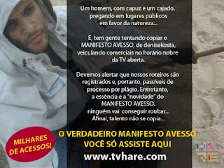 É, tem gente tentando copiar o MANIFESTO AVESSO de DeniseKosta. Veiculando comerciais no horário nobre da tv aberta. Devemos lembrar que nossos roteiros são registrados e, portanto, passíveis de processo por plágio. Entretanto.. a essência e a novidade do MANIFESTO AVESSO, ninguém vai conseguir roubar. Afinal, talento não se copia.